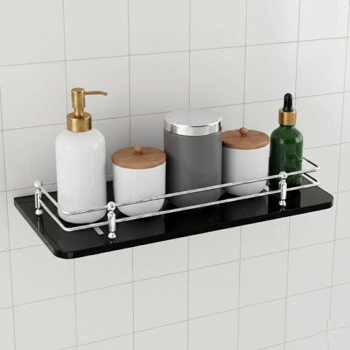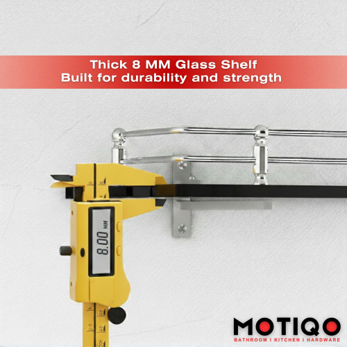 Protective Chrome Railing: Features an elegant, polished chrome guardrail to keep your soap, lotion bottles, and toothbrushes securely in place, preventing accidental slips and falls.